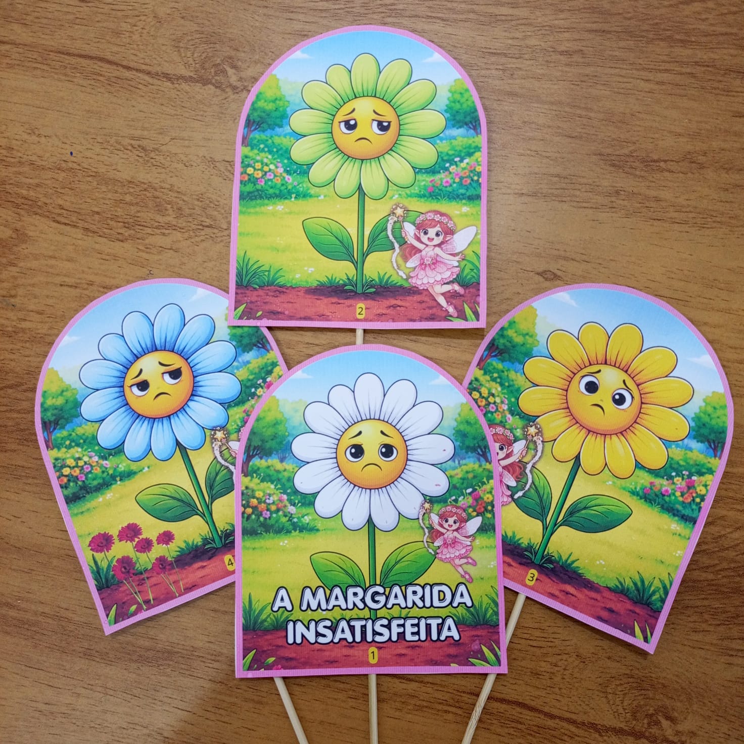 A história “A Margarida insatisfeita” conta a história de uma margarida que não queria ter as pétalas brancas. Com a ajuda da fada, mudou de cor varias vezes, mas sempre ficava insatisfeita. Por fim, percebeu que sua cor original era a que lhe deixava mais feliz.